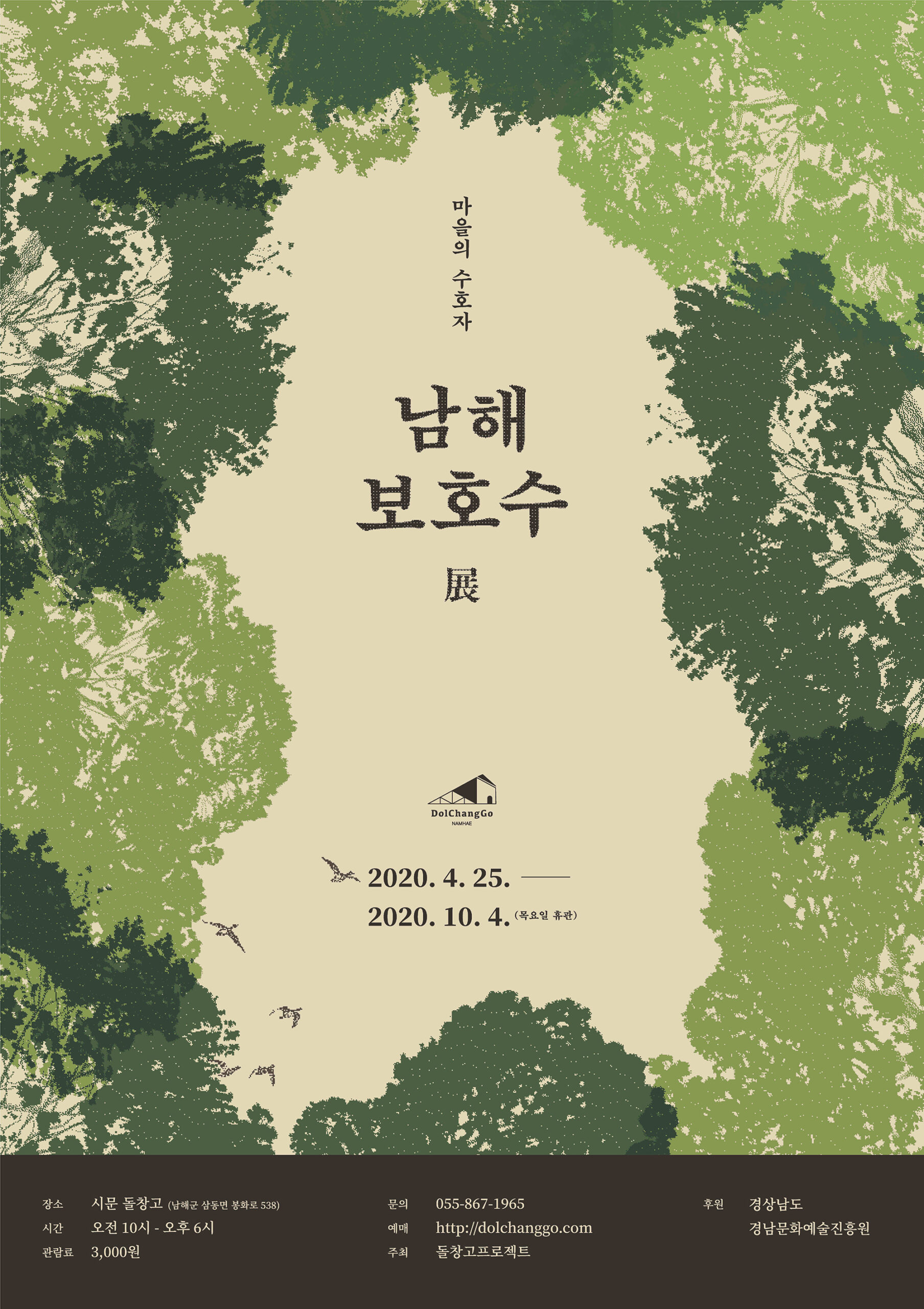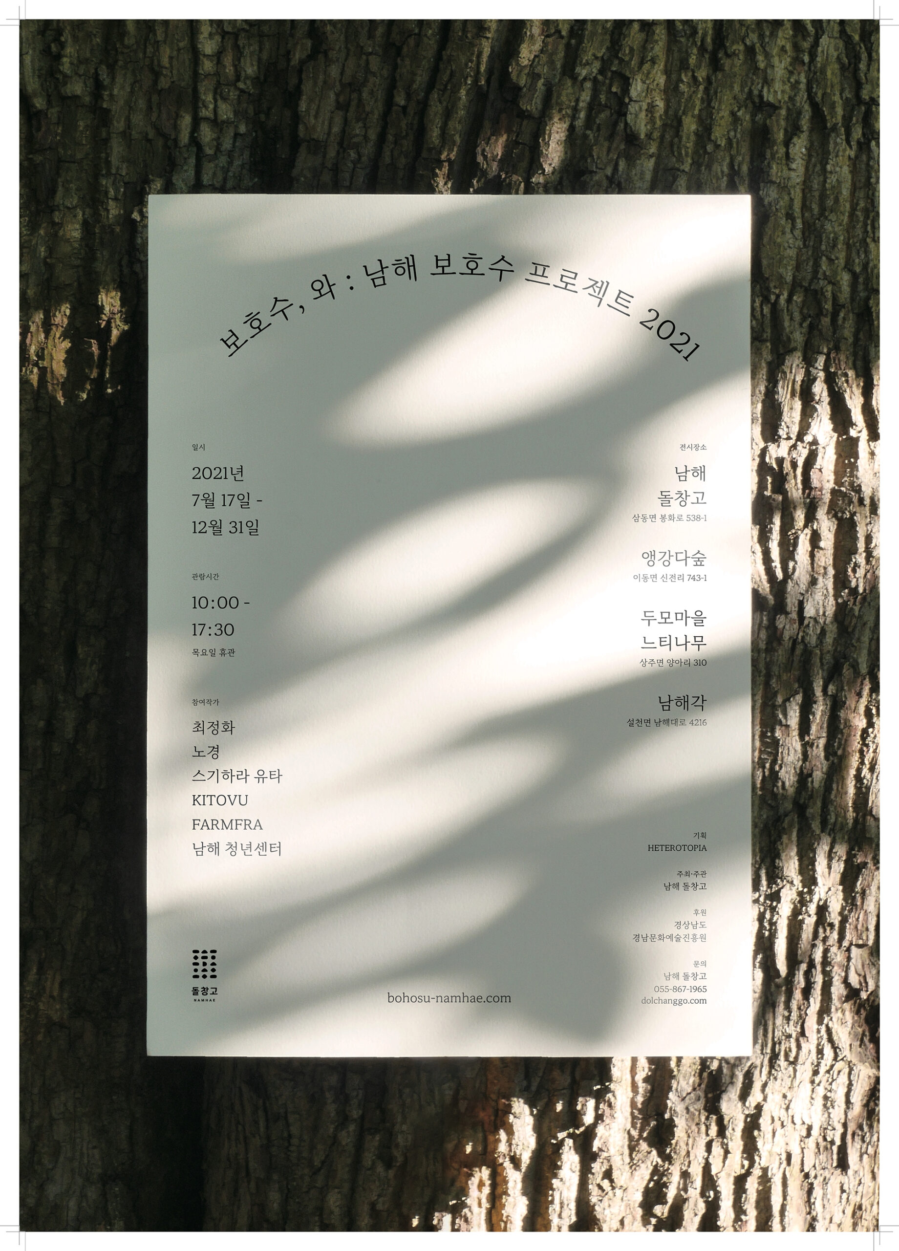 전시장소. 남해 돌창고 (경남 남해군 삼동면 봉화로 538-1), 남해각 (경남 남해군 설천면 남해대로4216), 두모마을 느티나무 (경남 남해군 상주면 양아리310), 앵강다숲 (경남 남해군 이동면 신전리 743-1)