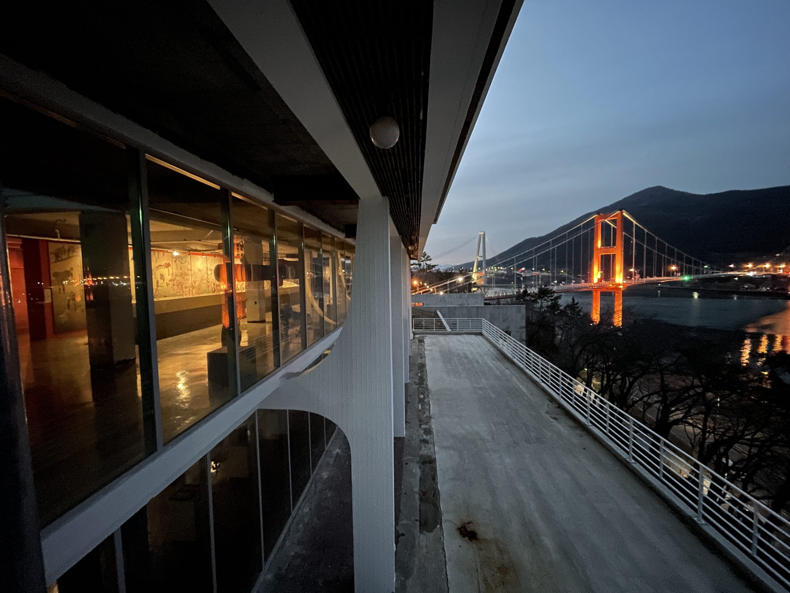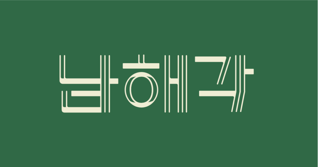 현수교인 남해대교와 그것을 건축적으로 표현한 남해각 외벽 줄눈의 반복되는 라인의 가볍고 가지런한 느낌을 남해각 로고의 기본 특성으로 잡았습니다. 서로 다른 두께를 가진 직선들을 조합하여 가로획은 남해대교의 교상deck 을 상징하는 굵은 선으로, 세로획은 얇은 케이블로 다리를 지탱하는 현수재suspender 를 상징하는 가는 선으로 표현했습니다.
