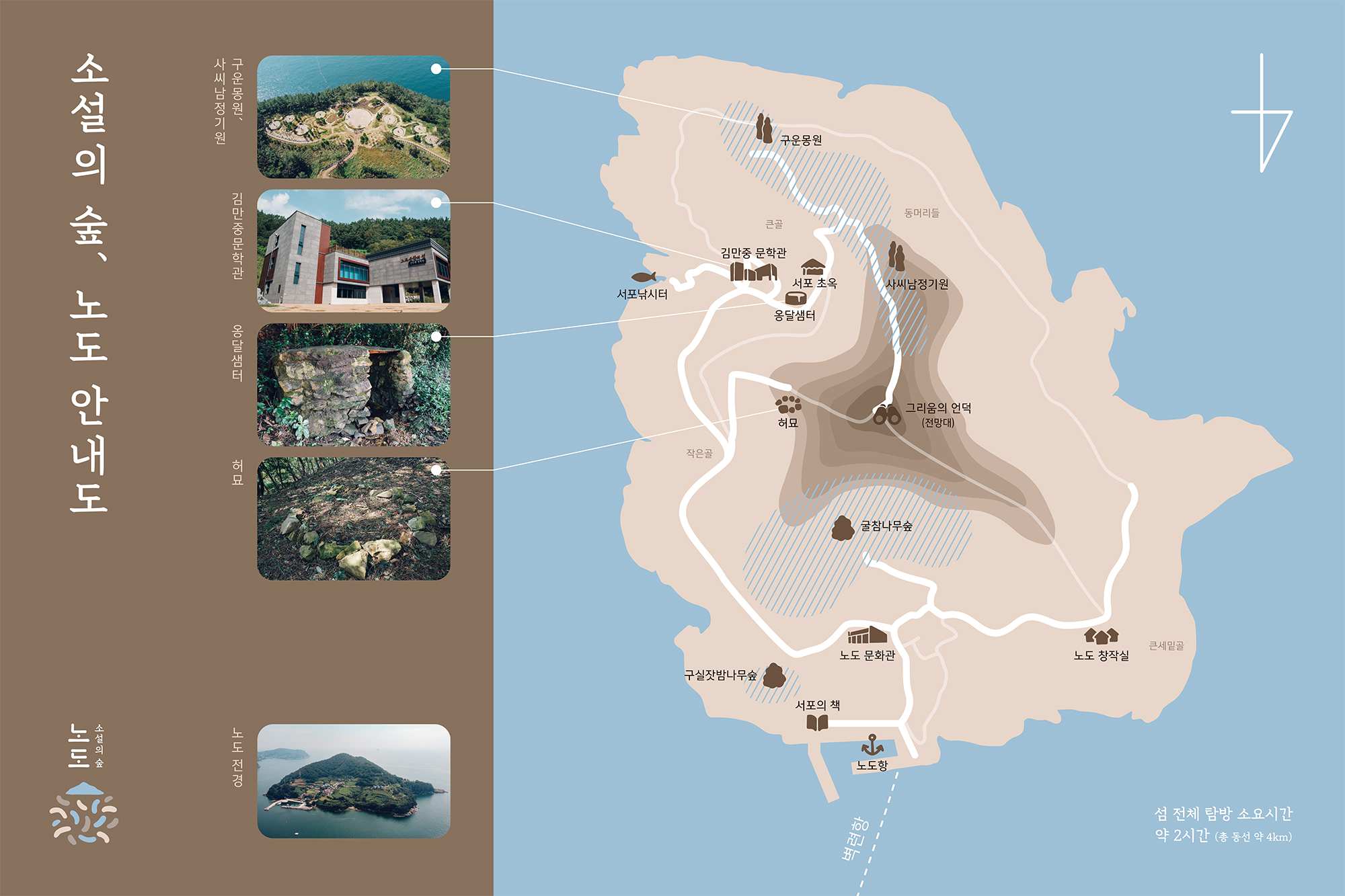 서포 김만중의 삶과 문학세계를 주제로 조성한 문학의 섬 노도를 매력적으로 어필할 수 있는 슬로건, 스토리, 로고, 사이니지, 시각물 디자인을 제안했습니다. 벽련항에서 보는 섬의 모양과 섬 이름의 유래이기도 한 상수리나무 열매의 형태는 로고의 모티브가 되었습니다. 자유롭게 뻗어나가는 밝은 색상의 곡선으로 이루어진 깍지 부분은 어우러져 살아가는 동식물과 인간의 생명력, 노도에서 펼쳐지는 소설과 이야기의 생명력을 드러냅니다.