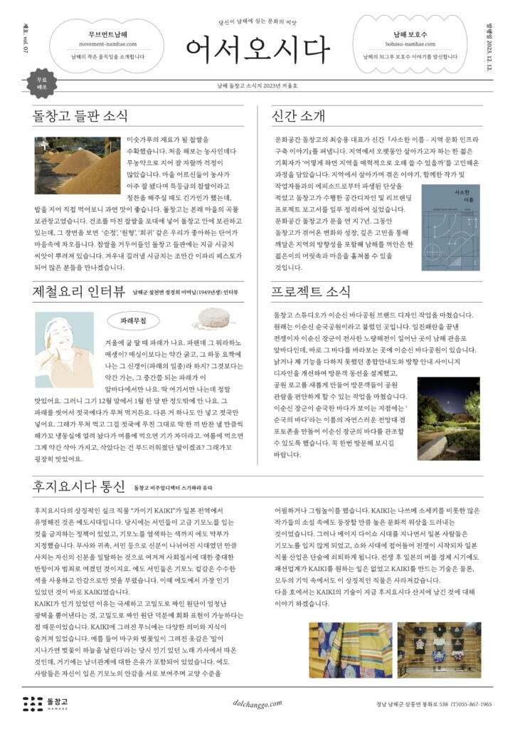 미숫가루의 재료가 될 찹쌀을 수확했습니다. 처음 해보는 농사인데다 무농약으로 지어 잘 자랄까 걱정이 많았습니다. 마을 어르신들이 농사가 아주 잘 됐다며 특등급의 찹쌀이라고 칭찬을 해주실 때도 긴가민가 했는데, 밥을 지어 직접 먹어보니 과연 맛이 좋습니다. 돌창고는 본래 마을의 곡물 보관창고였습니다. 건조를 마친 찹쌀을 포대에 넣어 돌창고 안에 보관하고 있는데, 그 장면을 보면 ‘순정’, ‘원형’, ‘회귀’ 같은 우리가 좋아하는 단어가 마음속에 차오릅니다. 찹쌀을 거두어들인 돌창고 들판에는 지금 시금치 씨앗이 뿌려져 있습니다. 겨우내 길러낼 시금치는 조만간 이파리 페스토가 되어 많은 분들을 만나겠습니다.