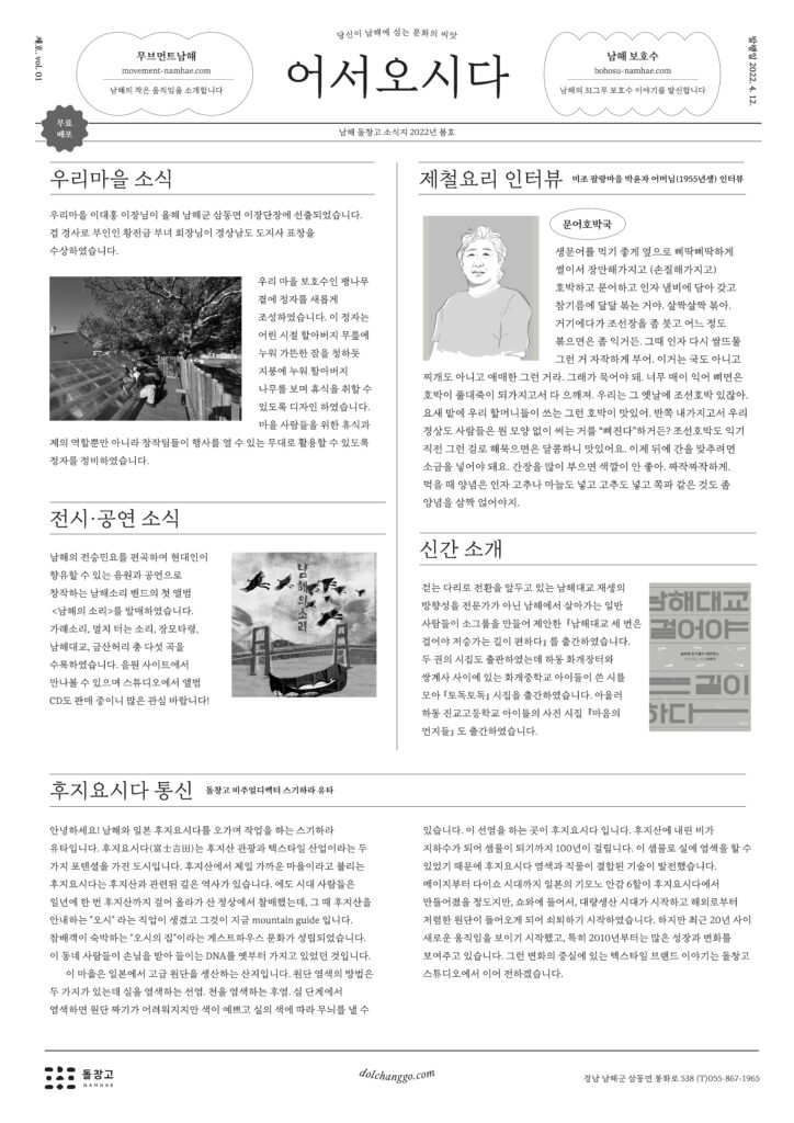 우리마을 이대홍 이장님이 올해 남해군 삼동면 이장단장에 선출되었습니다. 겹 경사로 부인인 황전금 부녀 회장님이 경상남도 도지사 표창을 수상하였습니다. 우리 마을 보호수인 팽나무 곁에 정자를 새롭게 조성하였습니다. 이 정자는 어린 시절 할아버지 무릎에 누워 가뜬한 잠을 청하듯 지붕에 누워 할아버지 나무를 보며 휴식을 취할 수 있도록 디자인 하였습니다. 마을 사람들을 위한 휴식과 제의 역할뿐만 아니라 창작팀들이 행사를 열 수 있는 무대로 활용할 수 있도록 정자를 정비하였습니다.
