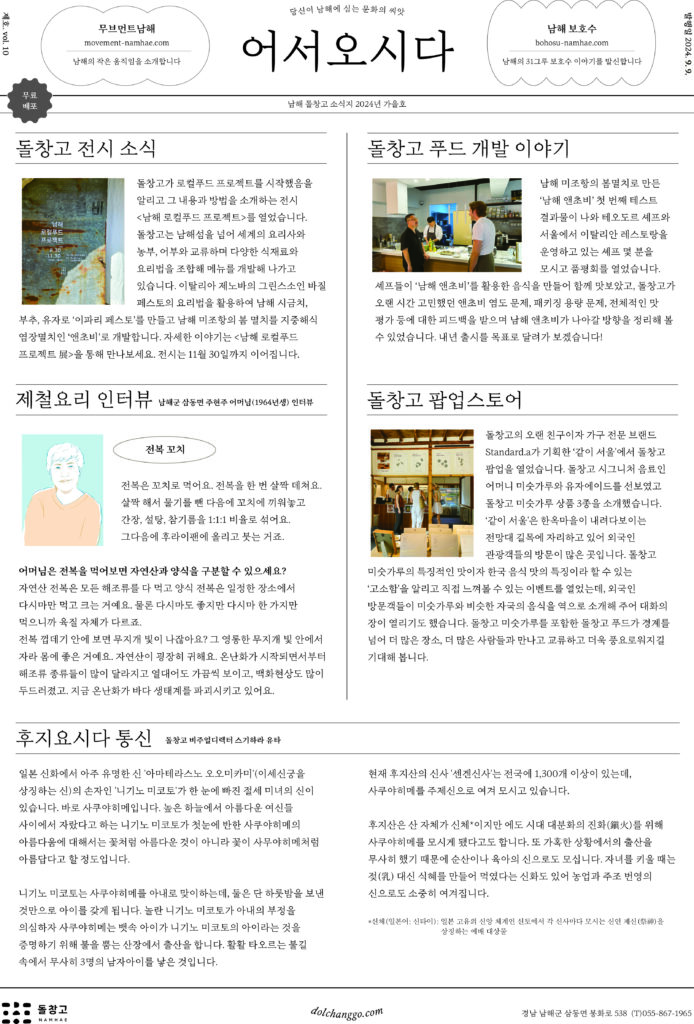 돌창고가 로컬푸드 프로젝트를 시작했음을 알리고 그 내용과 방법을 소개하는 전시 <남해 로컬푸드 프로젝트>를 열었습니다. 돌창고는 남해섬을 넘어 세계의 요리사와 농부, 어부와 교류하며 다양한 식재료와 요리법을 조합해 메뉴를 개발해 나가고 있습니다. 이탈리아 제노바의 그린스소인 바질페스토의 요리법을 활용하여 남해시금치, 부추, 유자로 ‘이파리페스토’를 만들고 남해 미조항의 봄멸치를 지중해식 염장멸치인 ‘앤초비’로 개발합니다. 자세한 이야기는 <남해 로컬푸드 프로젝트展>을 통해 만나보세요. 전시는 11월 30일 이어집니다.